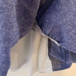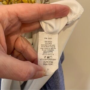 Hummingbird rayon/linen blend yellow and blue floral print on white background with tiered ruffle hemline tunic blouse/dress. Ties at shoulder and is lined. Pair it with white jeans! Cowgirl, hippie, boho, cottage core, spring and summer, flirty. Size M