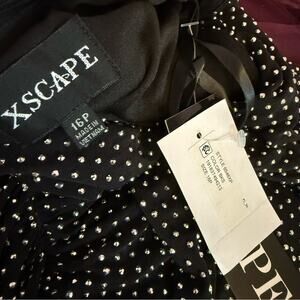 The Xscape gown in a rich black hue is a stunning choice for wedding guests, featuring a sophisticated v-neckline and long sleeves. Its ruched design elegantly contours the body, offering a flattering silhouette that flares slightly at the hem. Crafted from a stretchy fabric, this dress ensures both comfort and style for any formal occasion.