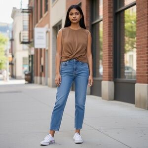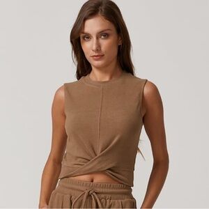 QINSEN Women’s Crewneck Twist Tank Front Crop Brown Sleeveless Sz Sm