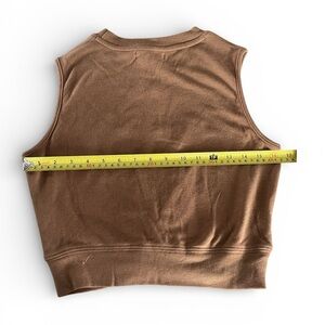 Designed in a warm brown neutral tone, this top pairs beautifully with joggers, leggings, denim, or layered under a jacket or cardigan. The sleeveless cut and cropped length create a modern, relaxed silhouette that’s both chic and versatile.