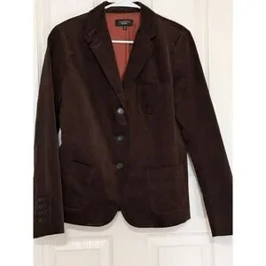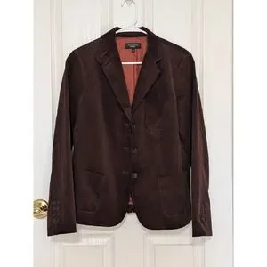 Talbots brown corduroy blazer jacket. This classic single-breasted blazer features a rich brown hue and a textured corduroy fabric. It has a notched lapel, three-button front closure, and two front flap pockets. The interior is lined with a smooth russet-colored fabric. Perfectly suited for a business casual office, a weekend outing, or a smart evening event.