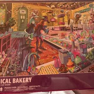 Magical bakery candy shop scene 1000 piece puzzle. Sealed. Puzzle size: 70cmx50cm. Difficulty: 6/10. Includes a 9.5”x12.5” reference sheet! Super cool puzzle.