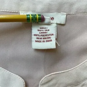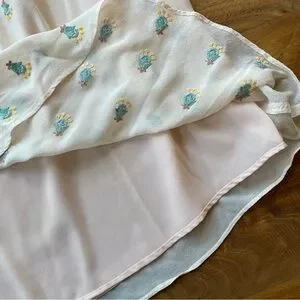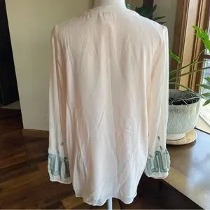 Charming blouse with floral embroidery and tie neck detail. Features long sleeves with decorative gathered elastic cuffs. Pretty silk blouse with front buttons and tie at the neckline. Body is lined and sleeves are sheer. Appears to be unworn with button bag still attached to tag. Excellent condition.