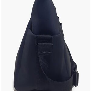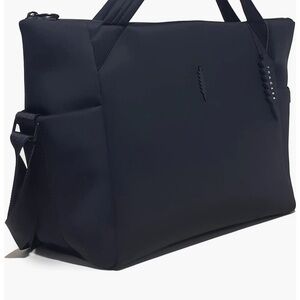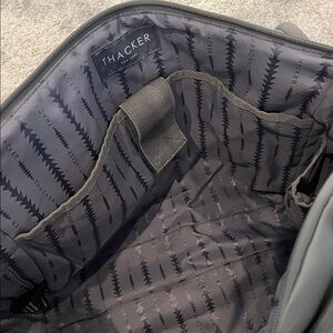 Thacker padded neoprene weekender in grey. Outer side pockets hold bottle or thermos. Has many interior slip pockets, including a Velcro pocket for laptop -size device inside. Also, one zip pocket. Has a trolly sleeve as well. Comfortable shoulder handles and an adjustable cross-body strap. Top zip closure.