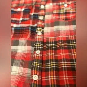 Mismatched plaid patterns in various shades of red, black, blue and white