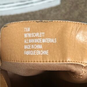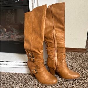 This is a pair of Maurices Scarlett heeled multi buckle boots in tan or brown faux suede