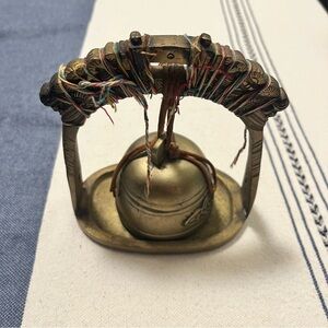Beautiful decorative brass bell with an intricate stand. Features a unique design with colorful accents. Includes leather ribbon and multicolored protection cord.