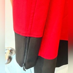 Mary Kay open-front blazer jacket in a bold red and black colorblock design. Features a collarless neckline, structured stretch fabric, and zippered front pockets. Fully lined and ideal for business, events, or professional wear.