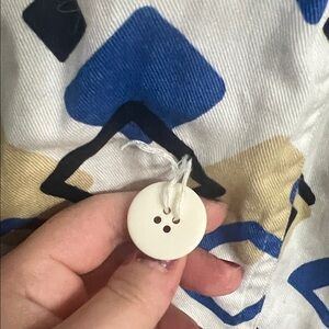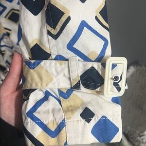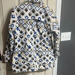 Chic jacket with bold geometric design. Features blue, black, and cream tones. Perfect for a modern look.