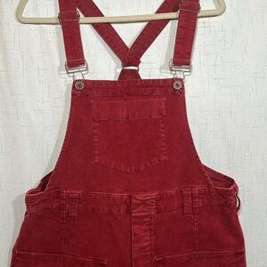 Stylish red corduroy jumpsuit. Features adjustable straps and front pockets. Perfect for casual outings. Pre-owned condition. Some light fading.