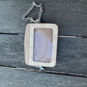 Elegant Coach card holder in light beige. Includes a sleek chain for easy attachment.