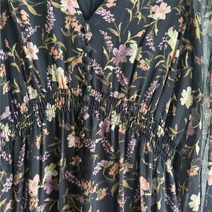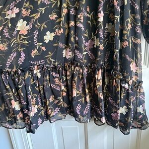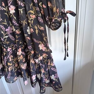 Elegant long sleeve dress with floral pattern. Features a v-neck, sheer sleeves with tied cuffs and ruffled hem. Perfect for any occasion.