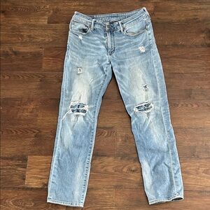 Keywords: Distressed Denim, Men's American Eagle Jeans, Men's Jeans, Men's Denim, Men's Lightwash Jeans, Men's Lightwash Denim, Distressed, Next Level Flex, American Eagle Outfitters, Jeans