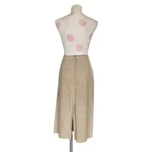 Vintage tan tweed skirt by Prestige, featuring a straight midi-length silhouette with a back slit for ease of movement. Structured waistband with side closure. Fully lined interior. Textured woven fabric with a classic neutral tone suitable for professional or vintage wardrobes. Clean tailored construction with a timeless profile.