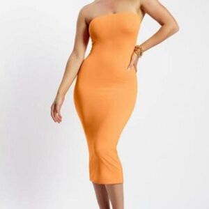 MESHKI Strapless Orange Bodycon Midi Dress
