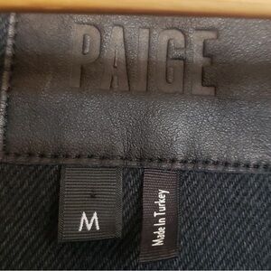 Sleek black denim jacket with frayed hem. Button-up front. Casual and stylish.