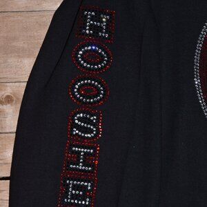 Custom made to order Indiana rhinestone bling black long sleeved shirt featuring a large IU design on front and a coordinating Hoosiers on the sleeve. This one will become your favorite good luck Game Day shirt! This shirt features a large Indiana logo on the front and Hoosiers design on the sleeve!