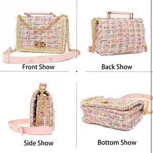 Elevate your style with this chic multicolor tweed handbag. Featuring a gold colored chain, this bag is perfect for any occasion. Its vibrant design adds a pop of pastel color to your outfit.