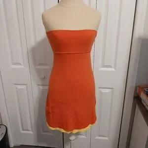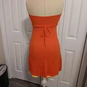 VS Strapless bra top, bright orange with a bright yellow under lined a-line skirt peeking out the bottom