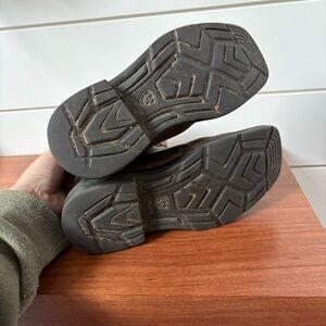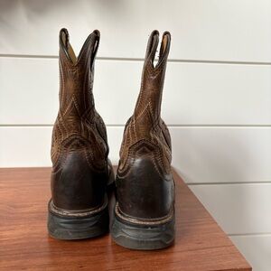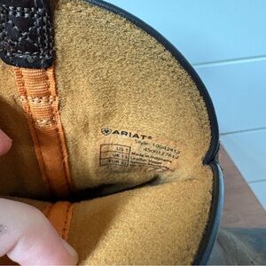 Ariat leather boots with tan interior. Durable and stylish. Great used condition - may have some scuffs and dirt, but no big flaws. Please refer to pics for details.