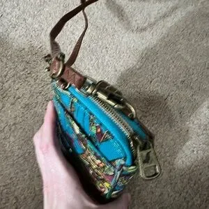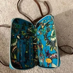 Sakroots crossbody bag with intricate multicolor design. Features vibrant patterns and adjustable strap.