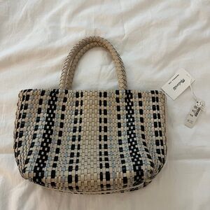 Stylish woven mini tote by Madewell. Features a classic black and cream pattern. Ideal for spring and summer