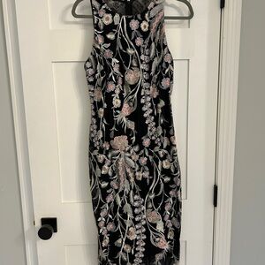 Elegant black dress with floral details. Ideal for special occasions. Never worn but tags missing.