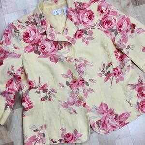 A burst of springtime elegance arrives with this Emma James blazer. The jacket features a delightful floral pattern with pink roses set against a soft yellow background. The 3/4 sleeves add a touch of casual sophistication, while the button-front closure allows for versatile styling. The tailored silhouette creates a flattering fit, making it a chic addition to any wardrobe. Note the small stains on the front of the jacket.