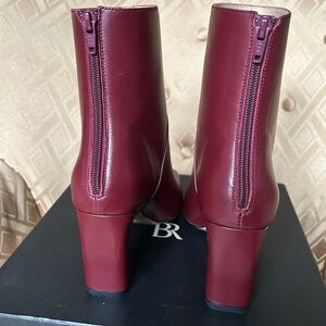New In Box Banana Republic Italian Leather Ankle Boot in burgundy size 9. Supple leather, back zip, still has sole covers on. 3.2” heel. Very comfortable and true to size. A few small smudge marks from box - see photos - not noticeable when wearing.