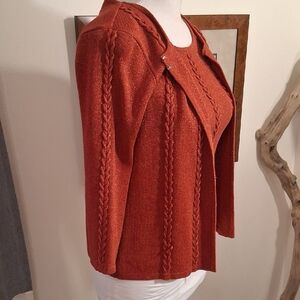 Sparkle cardigan twin set with cable knit details. Silk blend. very nice quality. cardigan sleeves are 3/4 length with a tank top. Ideal for cozy elegance.