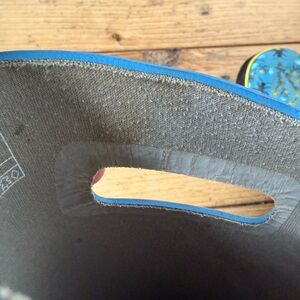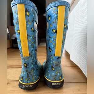 Bogs kids rain boots in Size 13. Fun blue and yellow bee pattern. High quality - durable and waterproof. Easy pull-on handles. Wore for less than a season - good condition structurally: minimal tread wear, no cracking or holes; some exterior and interior discoloration/staining (please see photos).