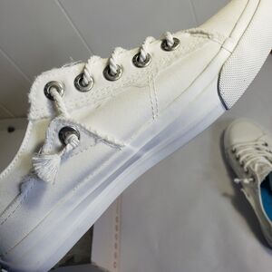 Blowfish White Canvas Sneakers these shoes are new have never been worn with a couple small flaws as shown in picture. A small smudge near bottom of one shoe and a tiny pencil lead sized spot of discoloration above smudge