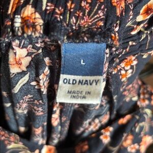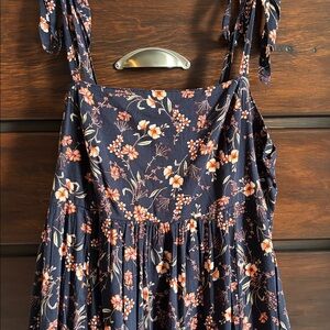 Chic floral maxi dress by Old Navy. Features a navy base with floral pattern. Perfect for casual outings. Has a slit in the front, around 16”. Worn once. Elastic waist with lots of stretch. The stock photo shows it to be shorter than how it is on me and I’m 5’4”. So for me it’s more of a maxi fit.