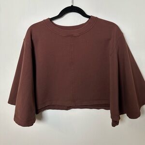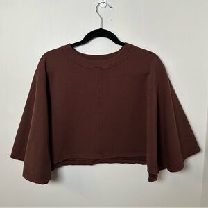 It features a loose and flowy fit. As well as a cropped length, and wide sleeves.