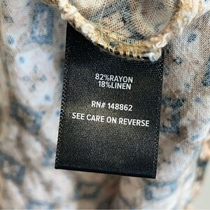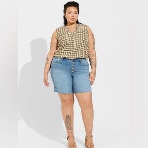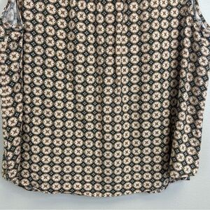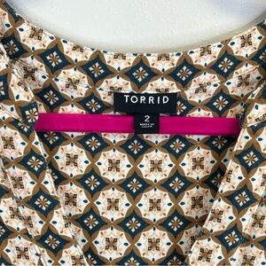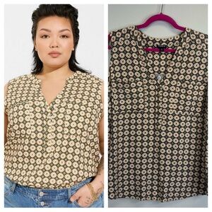 Torrid 2X Harper Linen blend Pullover Tank Top. Chic sleeveless blouse with geometric pattern. Perfect for casual wear. Features Brown, blue, and cream tones. 2 pockets on front.