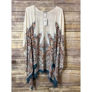 Keywords: J Jill, kimono, cardigan, cover up, one size, modal rayon, paisley print, bohemian, fringe, lightweight, beachwear, resort wear, neutral tones