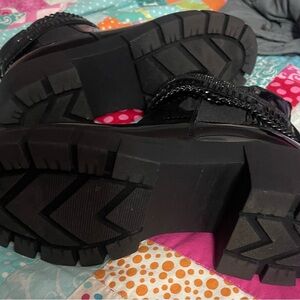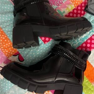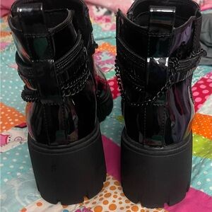 These boots are wide width and made for plus size. They are a bit heavy and run big. Some minor scratches on the sides and toe as happen to patent leather. Worn twice. Inside zip closure.