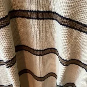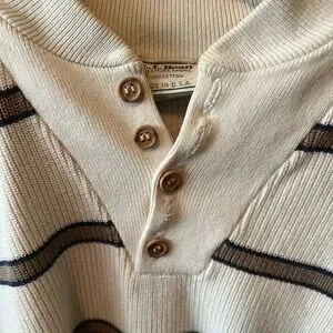 Classic crewneck sweater with cream and black stripes. Ideal for casual wear. 4 button front, 100% cotton, preppy style, clean, no stains, piling or snags.