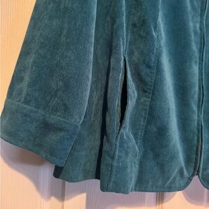 Elegant deep teal blue jacket with zip closure. Perfect for everyday wear. Pockets, cinch back design with beautiful button details throughout. Feels like a soft corduroy feel. Excellent like new condition!