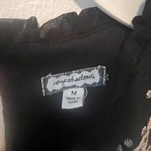 Eyeshadow branded tank top with peplum waist, pretty sheer dotted fabric with inner lining, floral lace pattern on neckline, and button closure in back.