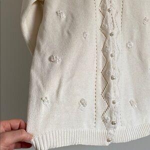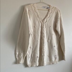 A delicate vintage knit with beautiful hand-feel and thoughtful detail. This Beecher’s Brook cardigan features a soft cotton base with crochet trim and raised floral motifs throughout, giving it that unmistakable heirloom charm. Feminine without being precious—easy to wear open over denim or buttoned as a top.