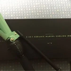 Harry Josh Pro Tools curling iron in mint green. Features a sleek black handle. Marcel Iron