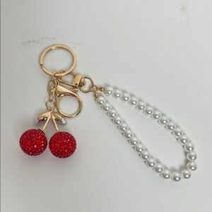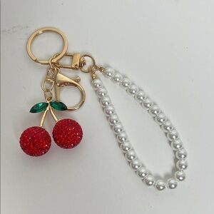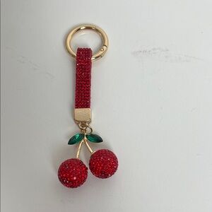 Add a playful touch to your accessories with this red cherry keychain. Featuring sparkling red cherries and elegant gold accents, it's perfect for any occasion.