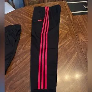 Comfortable and stylish Adidas kids track pants featuring bold red and white stripes. And black and white ones. Perfect for active days.