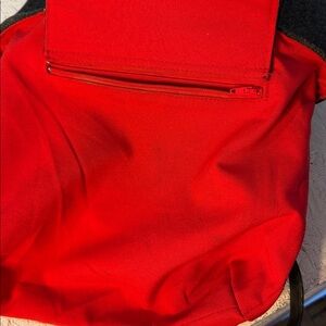 Kate Spade dark gray wool tote with red lining leather handles zipper inside pocket approximate size is 13 x 10 approx 10 inch hand drop strong, magnetic closure