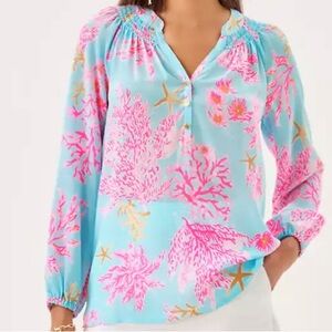 Brand New with Tags luxurious Lilly Pulitzer Elsa Silk Top in the gorgeous blue Royal Coral print!! Features include an easy fit pullover blouse with pretty gold buttons and bracelet length sleeves. This elegant silk top can be dressed up or down! Pairs well with casual or dressy pants, shorts or skirts as a perfect wardrobe staple. Roomy, soft fit for ultimate comfort and endless chic style!!🌸🌸