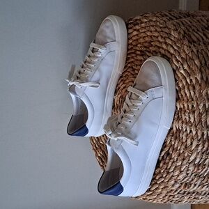 Trending luxury brand Vince men's classic athleisure/preppy/fashion/casual white suede/leather low sneakers with back heel navy panel. Pre-owned and in like new condition. Please see pictures.