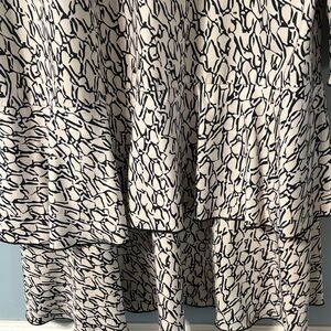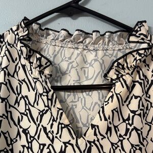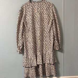 Discover elegance with this long sleeve dress, featuring a sophisticated cream and black pattern. Double tiered ruffle bottom, ruffle sleeves, and ruffle neck Add a belt to make it fitted or leave loose for easy breezy comfort. Like new. No labels with dress. Soft chiffon feel with no stretch.