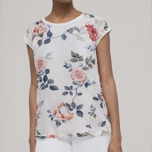 Chic blouse with pink and gray floral design. Lightweight and stylish.