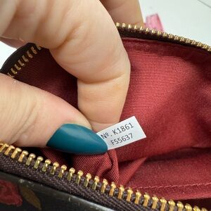 Authentic Coach zip cosmetic pouch in the rose floral print on signature coated canvas with leather trim. This is a versatile piece that works beautifully as a makeup bag, clutch, or bag organizer.